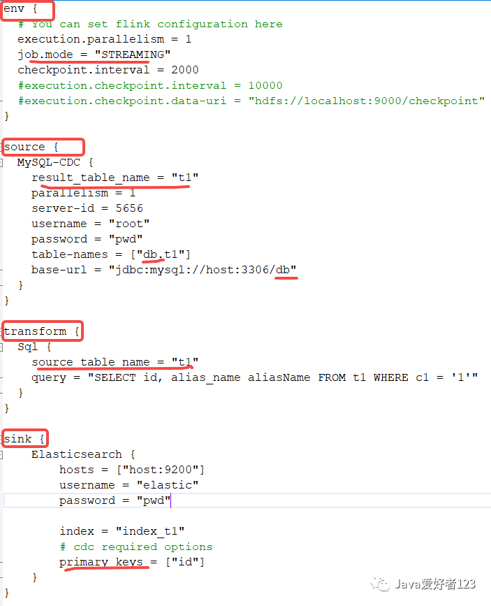 config 目录下,新建配置文件:如 mysql-es-test.conf 添加 env 配置。因为是实时同步,这里 job.mode = "STREAMING,execution.parallelism 是并发数