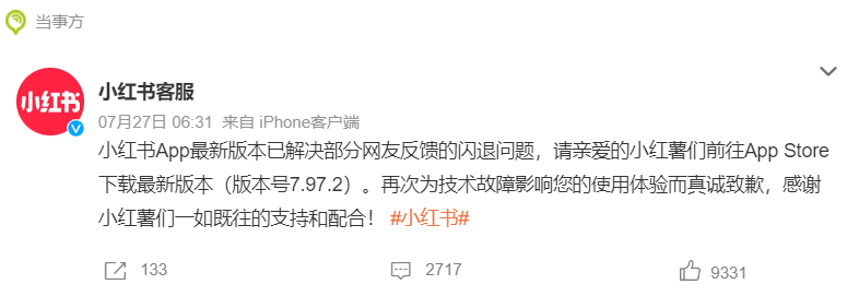 7 月 27 日有部分网友反馈小红书 App 出现闪退问题,随后#小红书崩了#等话题登上热搜。对此,小红书客服微博发文称,该问题系技术故障引起。如遇到小红书 App 无法启动的情况,用户可前往 App Store 下载最新版本(版本号7.97.2)。