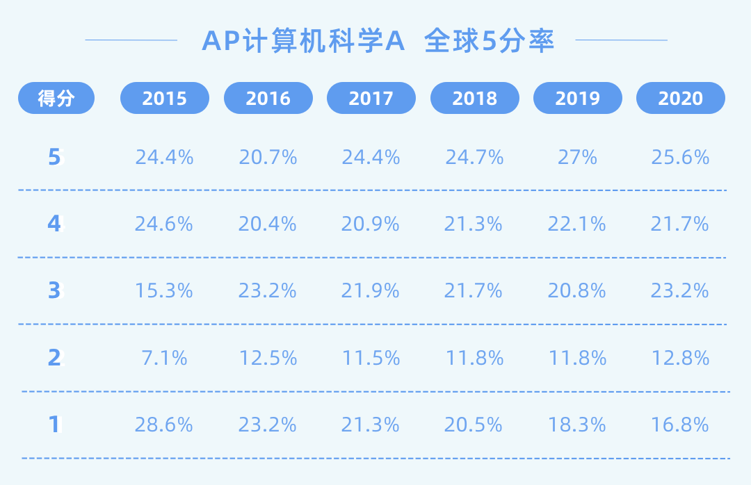 对比其他AP科目来说,计算机科学A 的5分率还是比较高的。通过CB官方给出的数据来看,计算机科学A报考人数也在逐年增加,可是5分率依然常年稳定在25%左右。不论从未来的学习生活的实际应用,还是从获得5分的难易程度来考虑,AP计算机科学A都是一门“墙裂”推荐大家学习的科目啊。