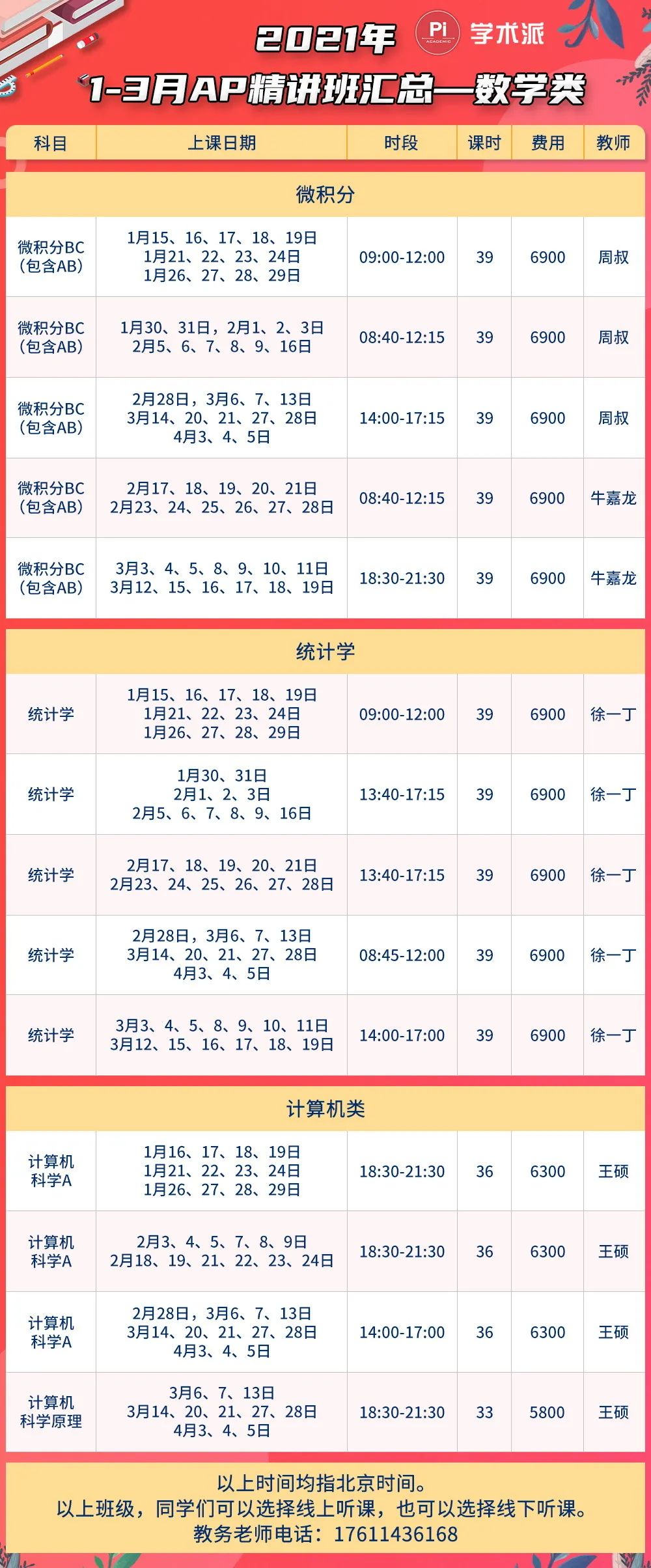 学术派 2021年 1月-3月 AP计算机精讲班 课程安排如下:
