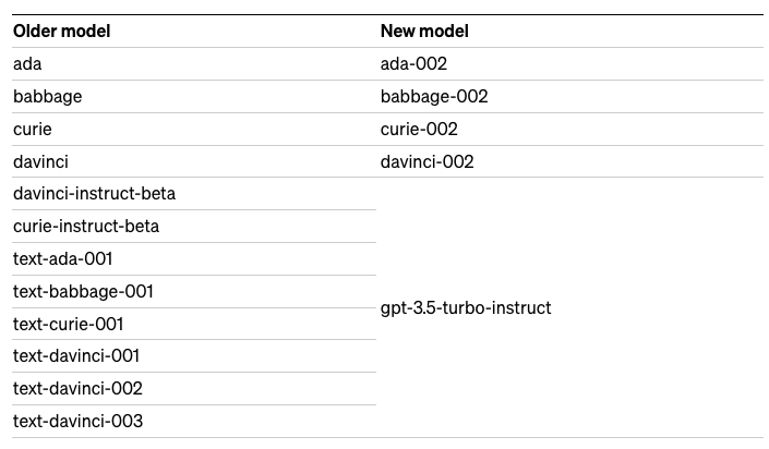 另外,OpenAI 也发布了旧模型的弃用计划。即从 2024 年 1 月 4 日开始,某些旧的 OpenAI 模型,特别是 GPT-3 及其衍生模型都将不再可用,并将被新的 "GPT-3 基础"模型所取代,新的模型计算效率会更高。