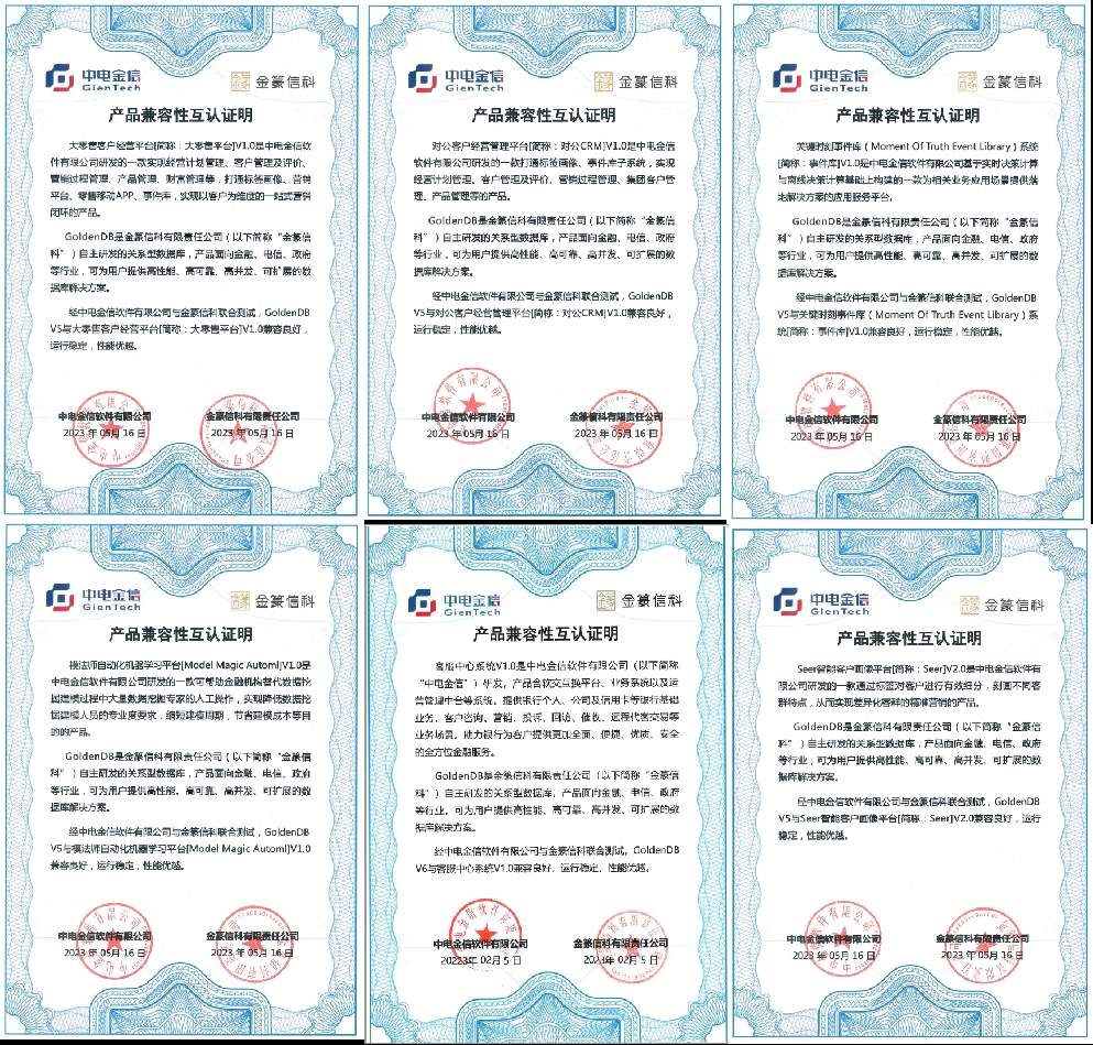 本次互认证,基于中电金信金融级数字底座“源启”,经过双方严格测试,中电金信的大零售客户经营平台V1.0、对公客户经营管理平台V1.0、关键时刻事件库V1.0、模法师自动化机器学习平台V1.0、客服中心系统V1.0、智能客户画像平台V2.0六款分布式架构产品,顺利通过GoldenDB分布式数据库兼容测试,实现安全可靠,稳定运行,性能卓越。
