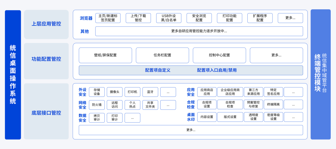 为此,1060可被纳管能力再度升级,配合统信集中域管平台(简称“域管平台”),提供底层接口管控、功能配置管控、上层应用管控三大层级的管控能力,为企业提供更科学、更高效的集中管理与运维,大大提高企业运维效率,降低运维成本。