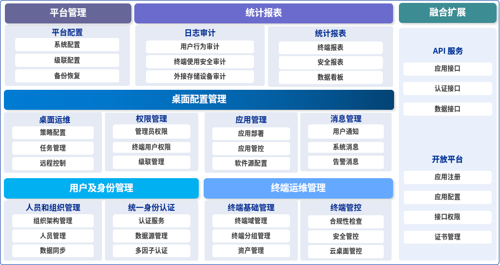 统信集中域管平台还针对行业客户管理大规模UOS终端的应用场景,提供用户及身份管理、终端运维管理、桌面配置管理、平台管理、统计报表、融合扩展等功能,解决大规模终端在国产操作系统环境下存在的信息管理复杂、认证帐号繁多、终端安全管理欠缺、应用软件维护困难等问题。