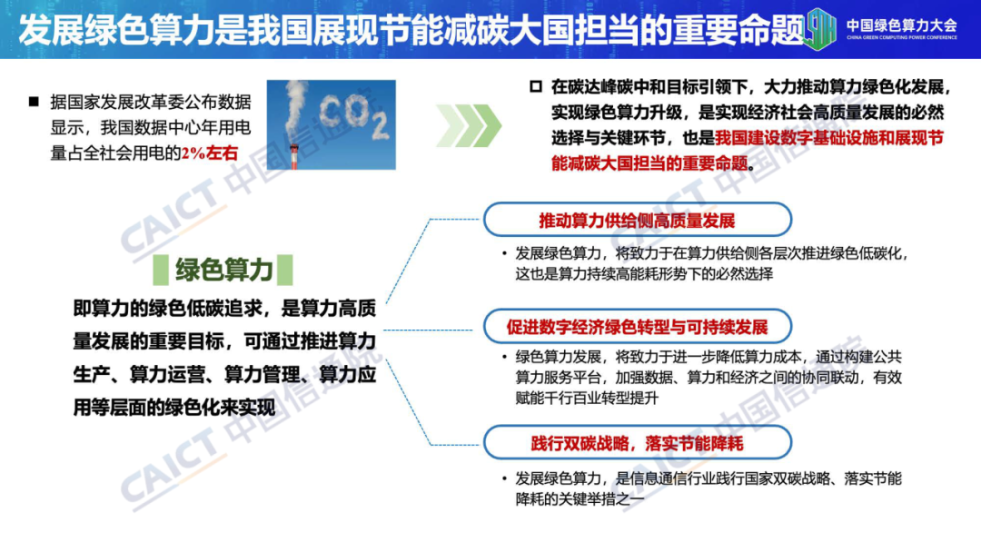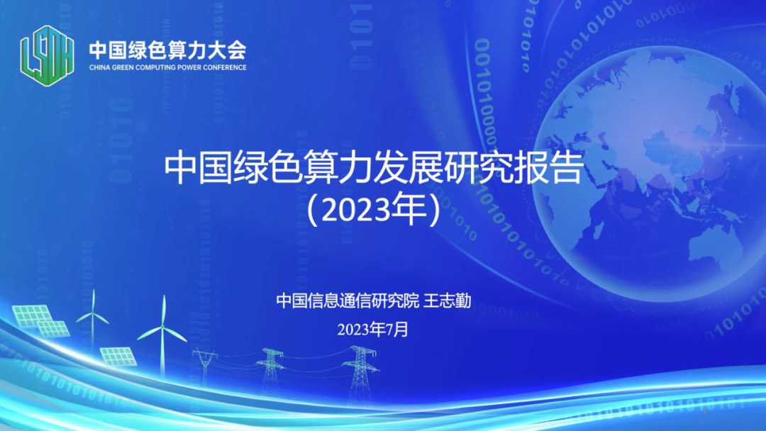在这样的背景形势下,中国信息通信研究院(简称“中国信通院”)联合内蒙古和林格尔新区管委会,共同编制了《中国绿色算力发展研究报告(2023年)》,希望与业界同仁共同推进绿色算力发展。2023年7月2日,在首届中国绿色算力大会上,中国信通院副院长王志勤发布并解读了《中国绿色算力发展研究报告(2023年)》。