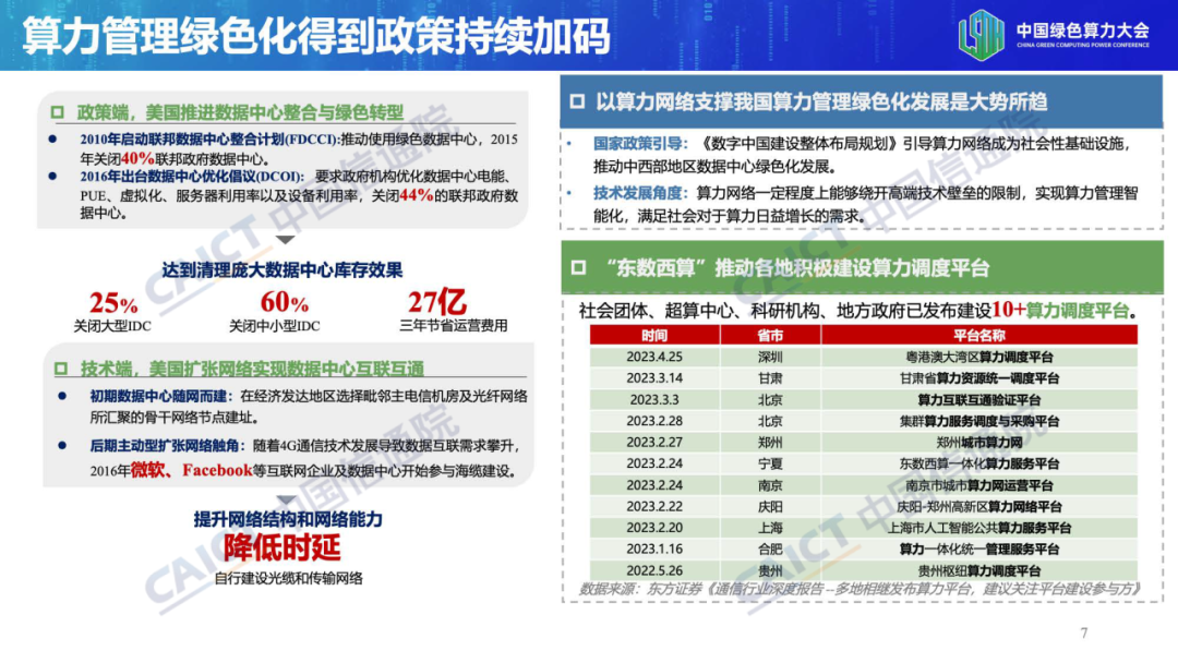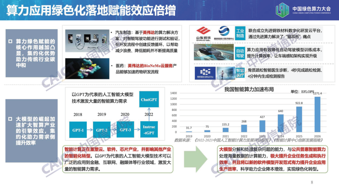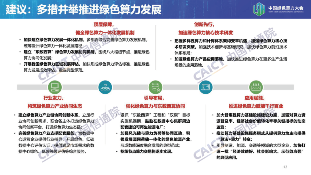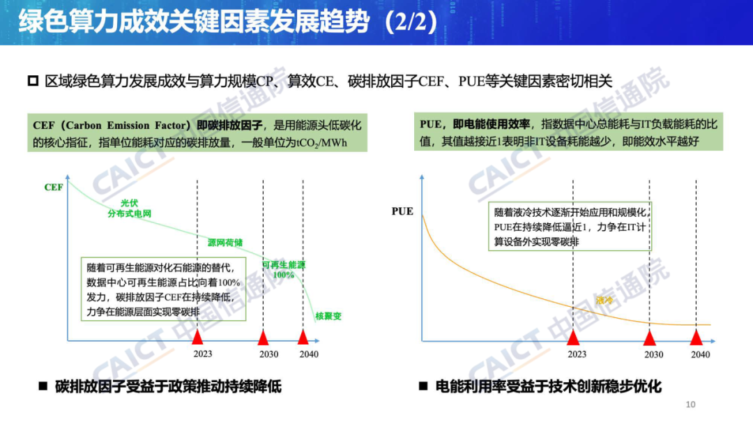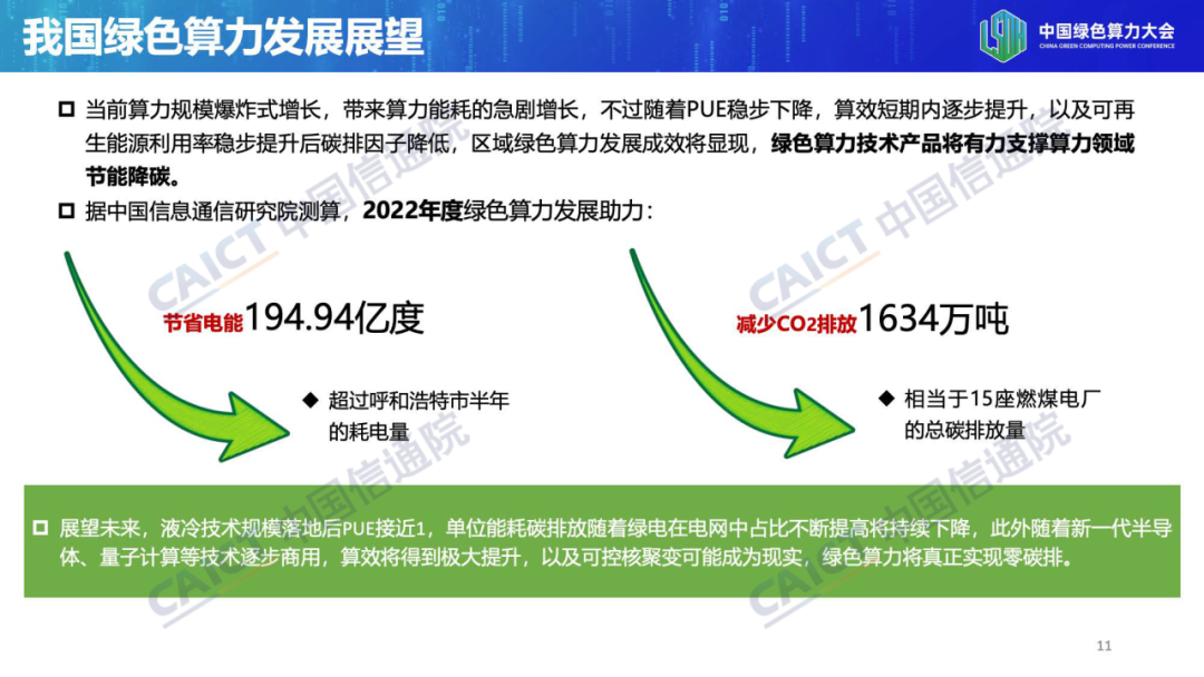 当前算力规模爆炸式增长,带来算力能耗的急剧增长,不过随着PUE稳步下降,算效短期内逐步提升,以及可再生能源利用率稳步提升后碳排因子降低,区域绿色算力发展成效将显现,绿色算力技术产品将有力支撑算力领域节能降碳。据中国信通院测算,2022年度绿色算力发展节能194.94亿度电,相当于呼和浩特市半年的耗电量;减少二氧化碳排放1634万吨,相当于15座燃煤电厂的总碳排放量。