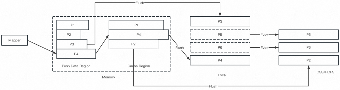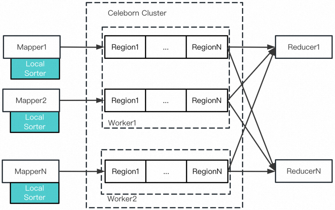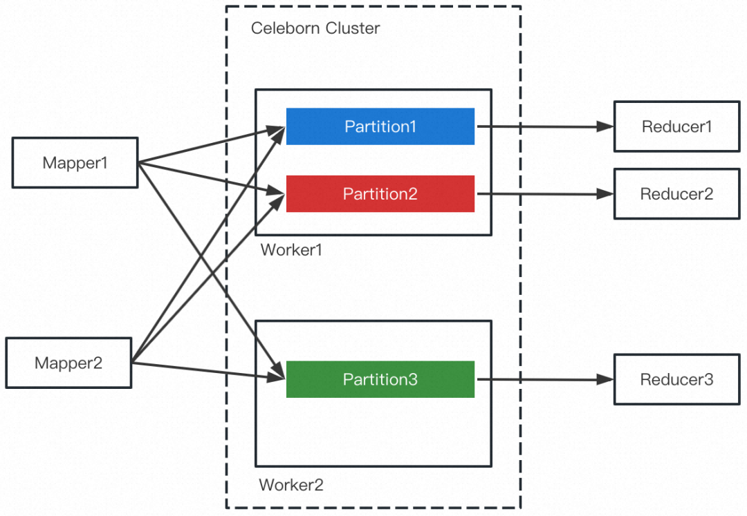 熟悉 RemoteShuffleService(简称 RSS)的同学知道,Push Shuffle + Reduce Partition 数据聚合是 RSS 的核心设计,如下图所示: