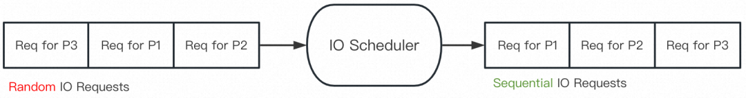 尽管 Region 内数据按照 Reduce PartitionId 做了排序,但由于来自不同 Reducer 的 Shuffle Read 的请求是随机的,依然无法做到顺序读盘。为了缓解随机 IO,Celeborn 引入了 IO Scheduling 的机制,对当前 IO 请求按照访问文件的 Offset 做排序,尽量把随机读转变为顺序读,如下图所示: