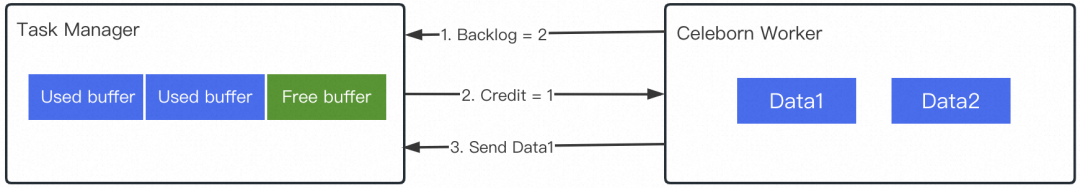 由于有了 MapPartition,Celeborn0.3.0 很自然的支持了 Flink。此外,为了让 Shuffle Read 的数据也由 Flink 的 Memory Manager 来管理,Celeborn0.3.0 支持了 Credit-Based Shuffle Read。简单来说,首先 Celeborn Worker 通知 Client 当前可读取的数据片数量(Backlog),Flink TaskManager 一旦有空余的内存 Buffer 便发送给 Worker 对应的 Credit,Worker 消耗一个 Credit 并发送一个数据片。流程如下图所示: