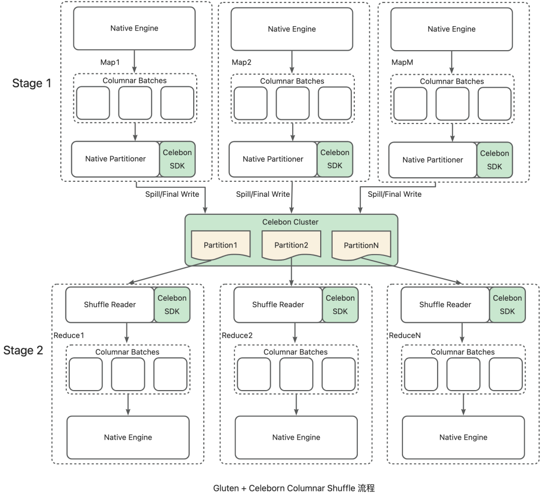 过去一段时间,Gluten 社区和 Celeborn 社区相互合作,成功把 Celeborn 集成进 Gluten。Gluten 集成 Celeborn 的设计目标是同时保留 Gluten Columnar Shuffle 和 Celeborn Remote Shuffle 的核心设计,让两者的优势叠加,如下图所示: