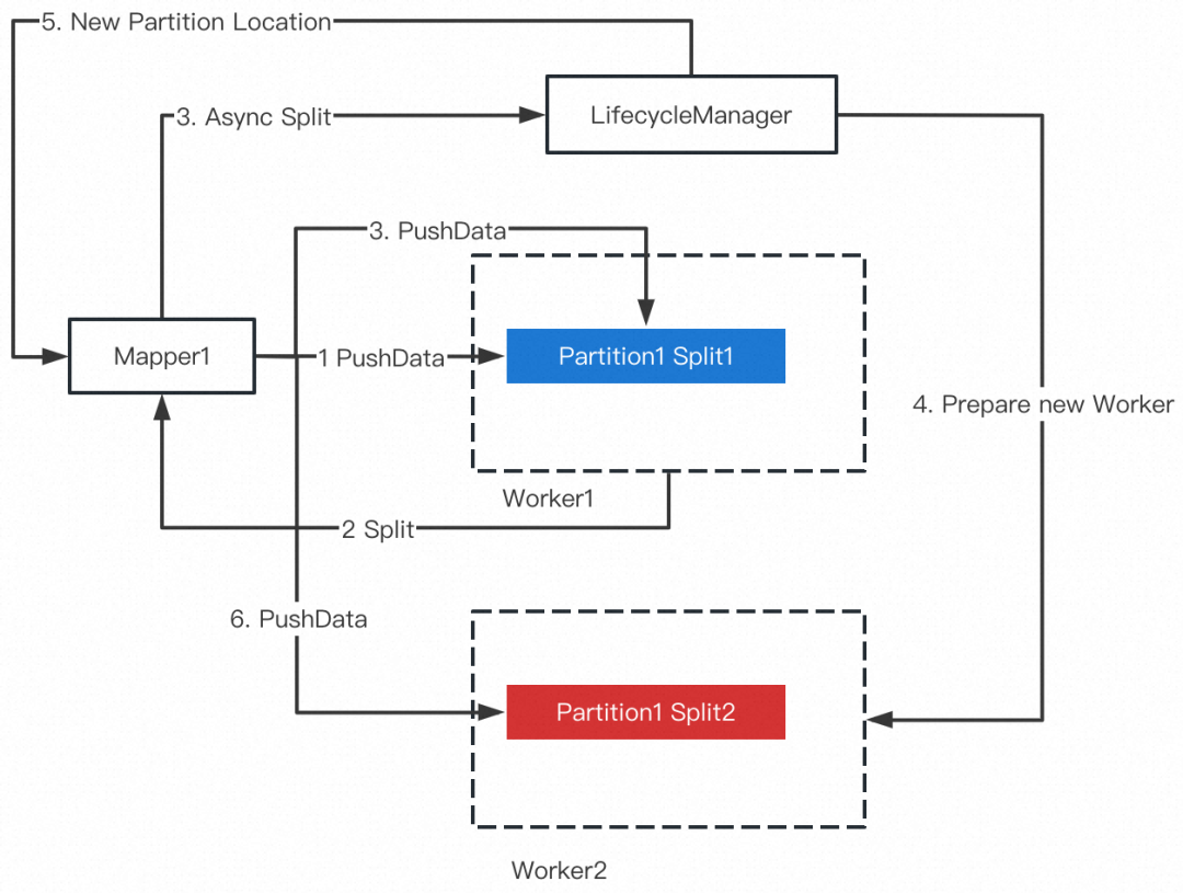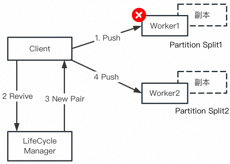 作为最重要的容错机制之一,Celeborn ShuffleClient 在发生 PushData 失败时会触发 Revive,LifecycleManager 重新选择一对 Worker,同时当前 Partition 发生一次分裂,如下图所示:
