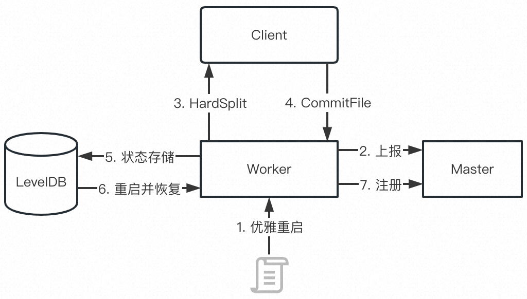 此时 Worker 退出进程并等待重启。重启之后,Worker 从 leveldb 中恢复状态,可以正常服务本地 Shuffle 数据的读取请求,以及接收新的 Shuffle Write。整体流程如下图所示: