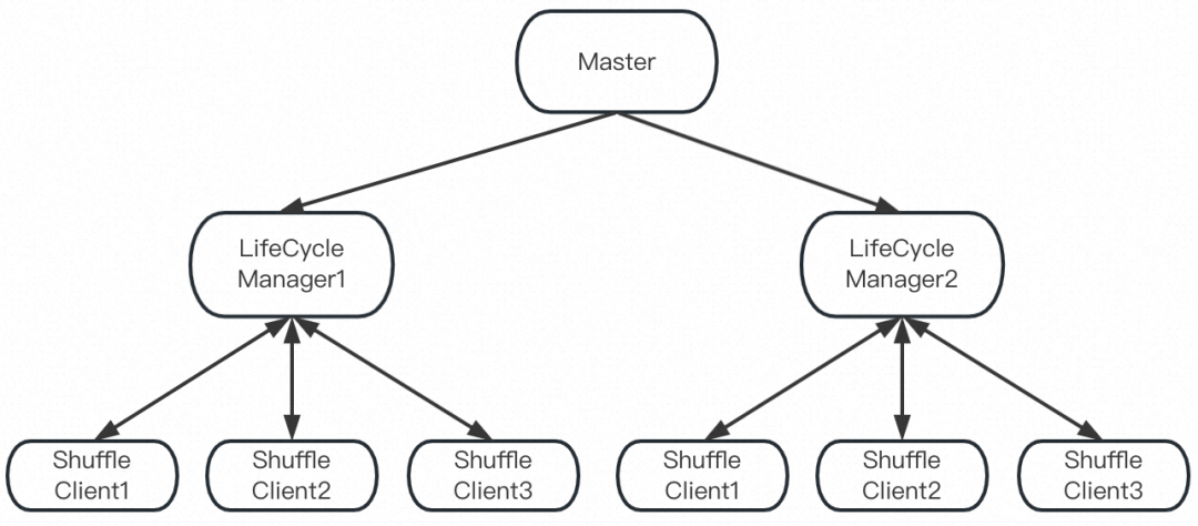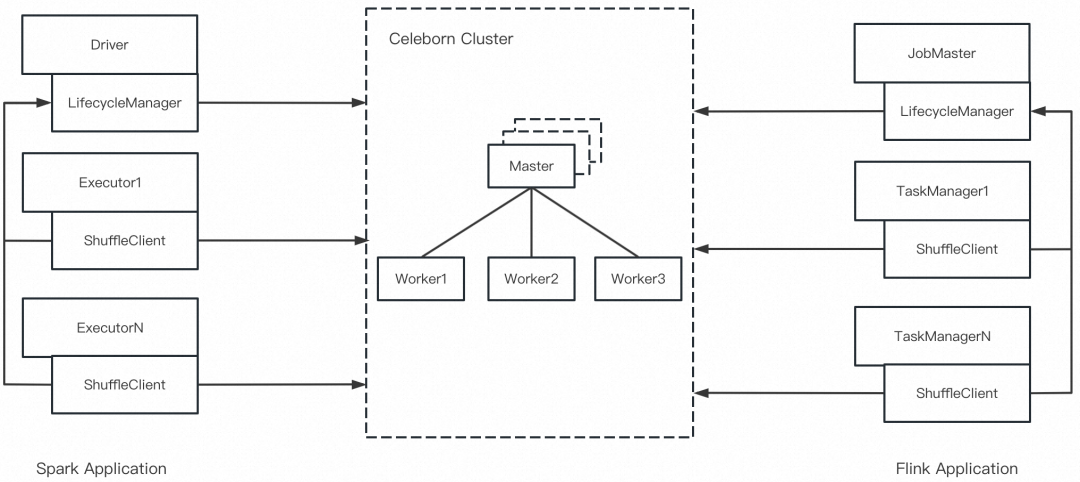 在 Celeborn 的架构里,Master 负责管理 Celeborn 集群的状态,整个集群只有一个 Active 实例;LifecycleManager 负责管理 Application 的 Shuffle 状态,每个 Application 有一个实例;ShuffleClient 存在于计算引擎的调度单元里(i.e. Spark 的 Executor,Flink 的TaskManager),每个容器进程有一个实例。示意图如下: