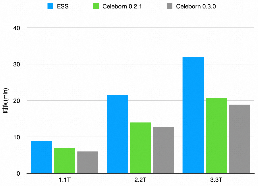 在这个测试场景中,我们测了 1.1T/2.2T/3.3T 的纯 Shuffle 场景,并对比 ESS, Celeborn 0.2.1, Celeborn 0.3.0 的总时间。