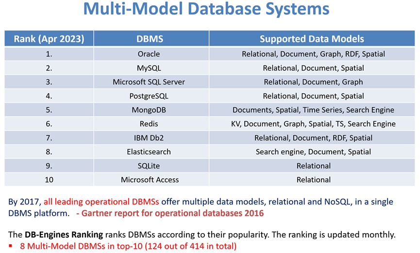 近年来,随着各类实际应用场景的需求,关系数据模型得到扩展,支持嵌套关系模型(Nested Relational Model,即舍弃了关系模型第一范式的要求)、对象-关系模型(Object-Relational Model)、JSON等半结构化数据等。根据DB-Engines网站对DBMS的排名,位列前10名的数据库有8个声称自己是多模数据库(图2),即支持多种数据模型,包括Oracle、MySQL、Microsoft SQL Server、PostgreSQL、MongoDB、Redis、IBM Db2、Elasticsearch等。与此同时,也出现了多种多模查询语言(Multi-Model Query Language);除上述主流数据库管理系统外,代表性的包括ArangoDB Query Language(AQL)、OrientDB的OrientQL等。