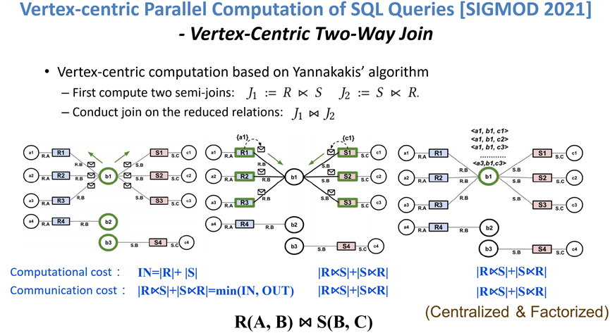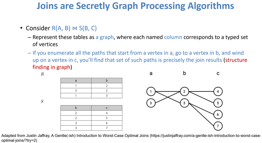 允许以点中心(Vertex-Centric)计算等方式对关系数据库进行操作; 通过扩展关系代数和SQL语法支持图查询分析处理; 通过更高效的连接操作(如WCO Join)提升图查询(如子图匹配)的效率。本文主要介绍(1)和(2);(3)的代表性工作可参考Mhedhbi, Amine, and Semih Salihoğlu. "Modern techniques for querying graph-structured relations: foundations, system implementations, and open challenges." Proceedings of the VLDB Endowment 15.12 (2022): 3762-3765.等相关综述工作。