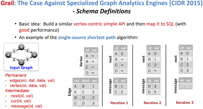 以Grail执行单源最短路径算法(Single-Source Shortest Path,SSSP)为例,从算法设计角度,可利用点中心的BSP模型(图10)。从算法实现角度,可构建点表vertex(id, data, val)和边表edge(src, dst, data, val),将图存储为关系数据(图11)。为了支持计算,还需若干临时表(next、cur和message)。如此一来,通过关系操作即可实现图10中的算法。