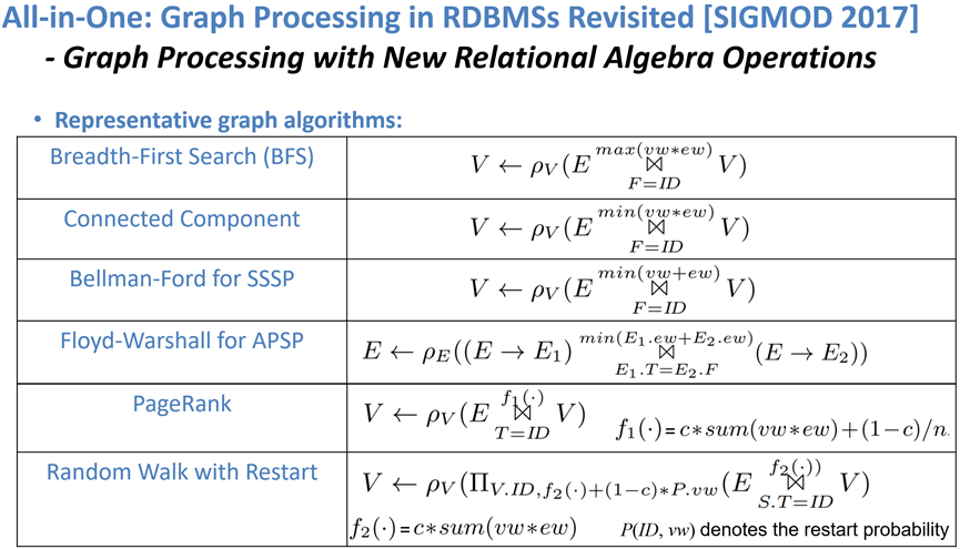 该方法将图简单的存储为一个点表V(ID, vw)和一个边表E(F, T, ew)。利用新的关系代数操作,可实现对多种图算法(单步操作)的表达(图13):