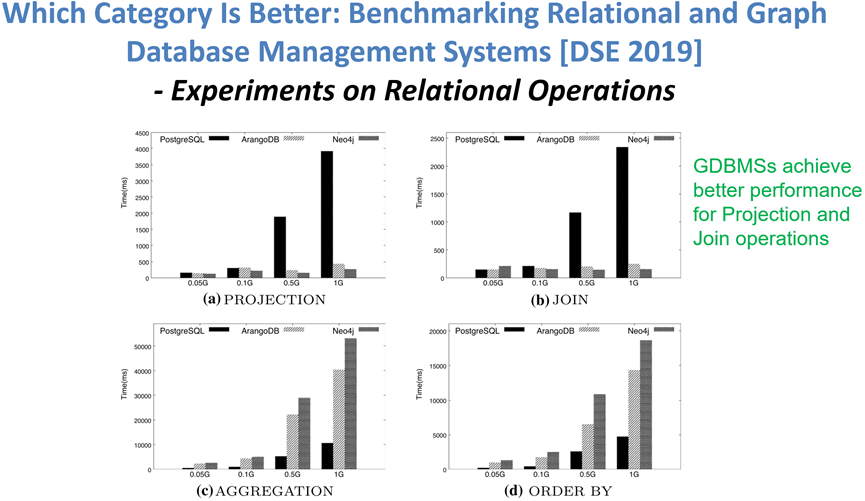 图处理技术和图数据库系统同样可用于加速关系查询。人民大学卢卫、杜小勇老师团队首次融合RDBMS(TPC-H)和GDBMS(LDBC)的benchmark进行测试,结果表明即使对关系基本操作如投影(Projection)、连接(Join)、聚集(Aggregation)和排序(Order By),GDBMS在投影和连接操作上较RDBMS有一定优势(图15)。