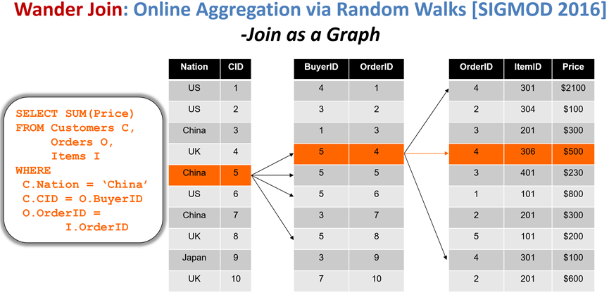 我们主要介绍两个代表性工作,分别利用随机游走的思想加速在线聚集(Online Aggregation)查询,和利用图建模的思想加速关系型OLAP查询。