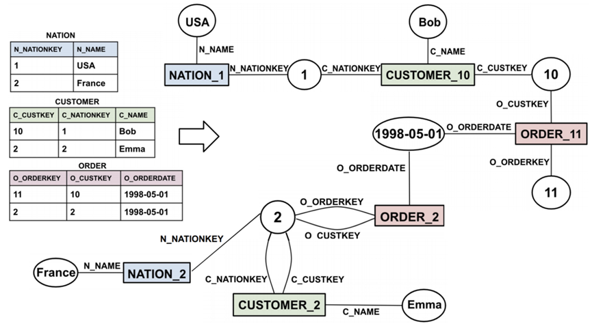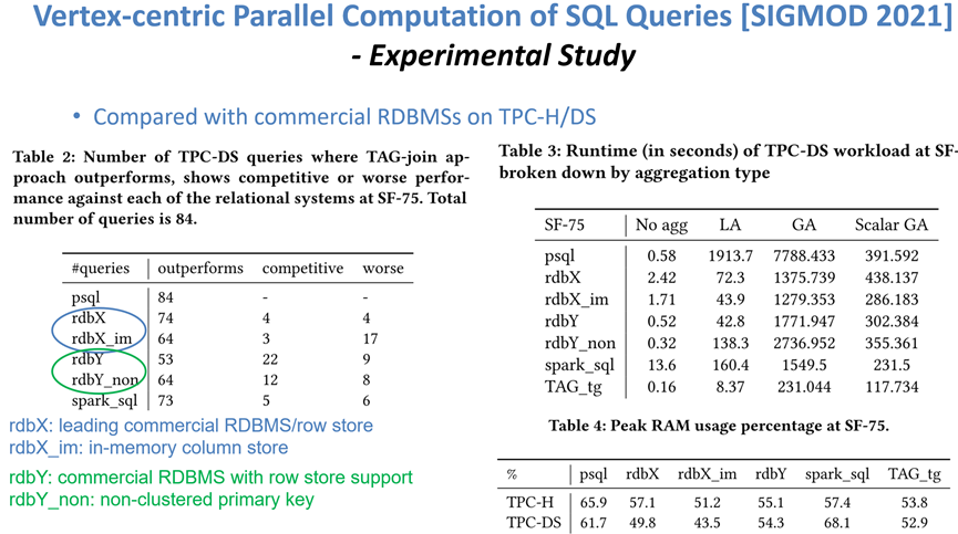 UCSD某团队与TigerGraph合作,在SIGMOD 2021发表了Vertex-centric Parallel Computation of SQL Queries论文,通过将多个关系表存储为类似RDF的图结构,并采用多线程实现点中心图计算来加速TPC-H查询。具体的,该方法首先使用Tuple-Attribute Graph (TAG)存储关系型数据(图17):