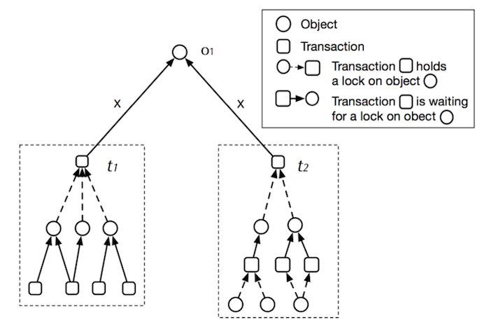 FCFS(First Come First Served) 先到先得:按事务请求行锁的顺序来调度;CATS (Contention-Aware Transaction Scheduling) 热点感知事务调度:根据事务阻塞的其他事务的个数来判断调度顺序。如下图所示,由于事务t1阻塞了4个事务,而t2阻塞了3个,所以t1优先。通过以上的说明我们可以看出,CATS算法在有数据访问热点,也就是多个事务集中等待相同锁资源的情况下能提升整体的事务处理能力。比较形象的比喻就是堵车的场景,我们可以让车上人多的车,比如公交车优先通过,来提升整体的道路通行效率。- 在增加每一把行锁时,更新所有相关事务的edge(等待关系)。