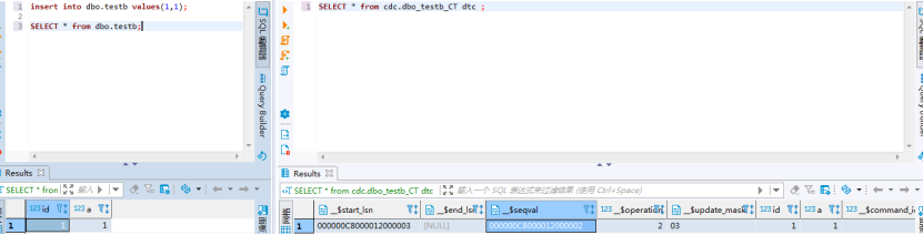 配置完成CDC后,SQLServer将会捕获相关的数据变更,可以通过插入/更新/删除相关表的数据来进行验证。假设create table dbo.testa(id int primary key,a int)表已经完成CDC配置