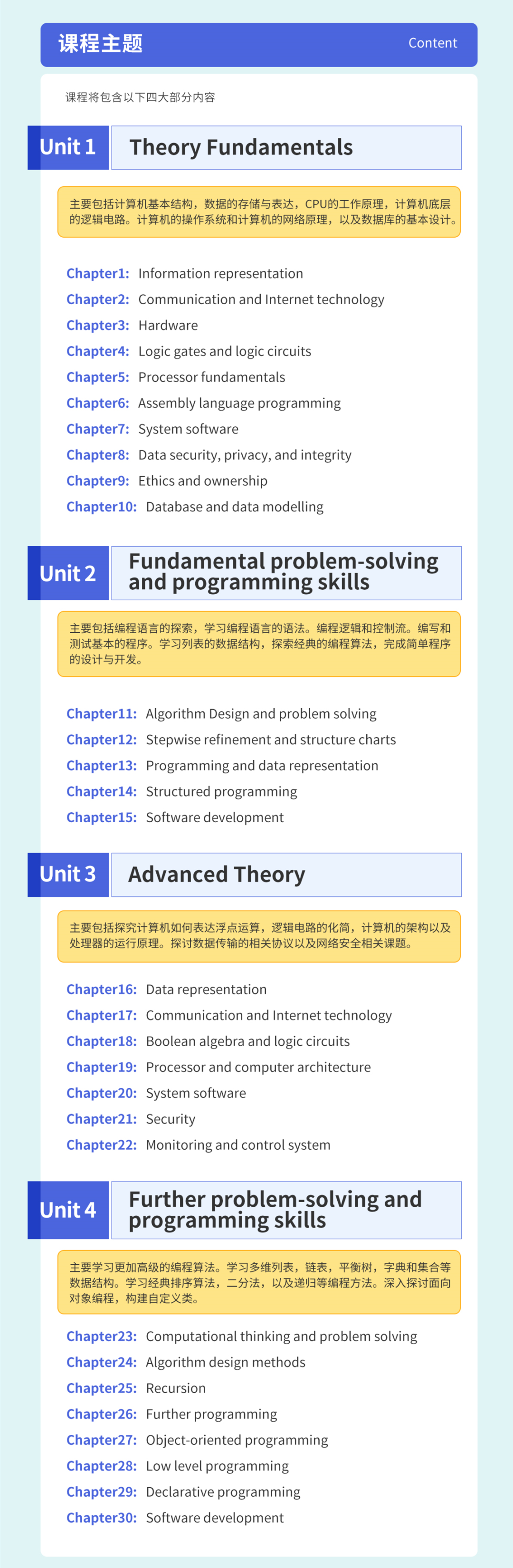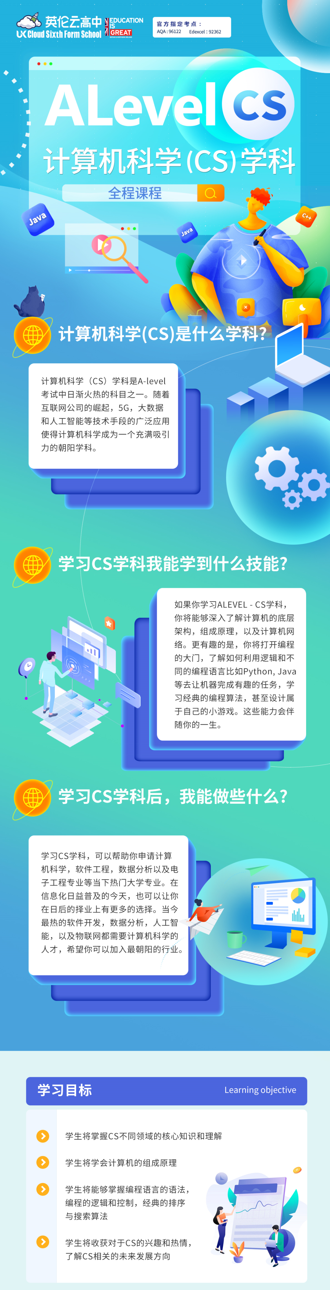 到A-level课程结束时,学生将对计算机科学有一个整体的认识,明确这门学科是否适合自己,或者将来想要关注计算机的哪一个领域。