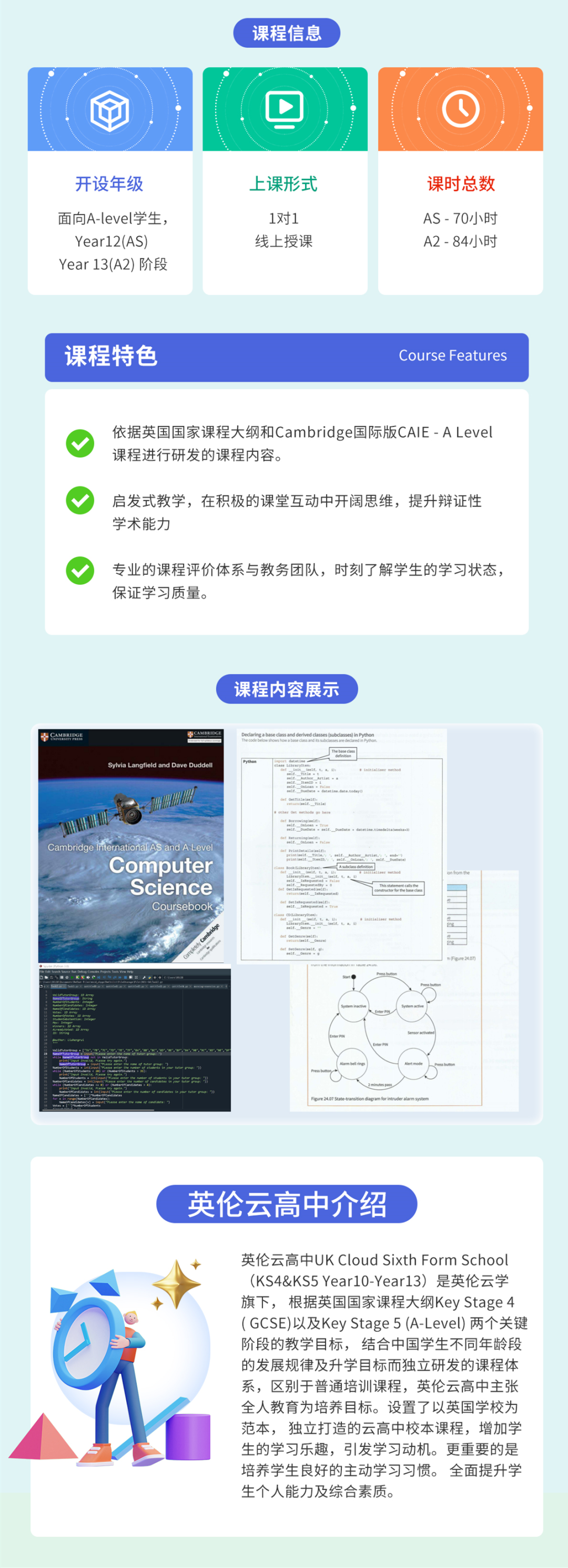 想要足不出户在家学习A-level计算机科学,英伦云高中的A-level计算机科学全程课可以为你提供最全面的帮助。线上一对一授课,为 A-level学生(AS/A2)提供系统、专业的帮助与支持,详情添:alevelbaike咨询