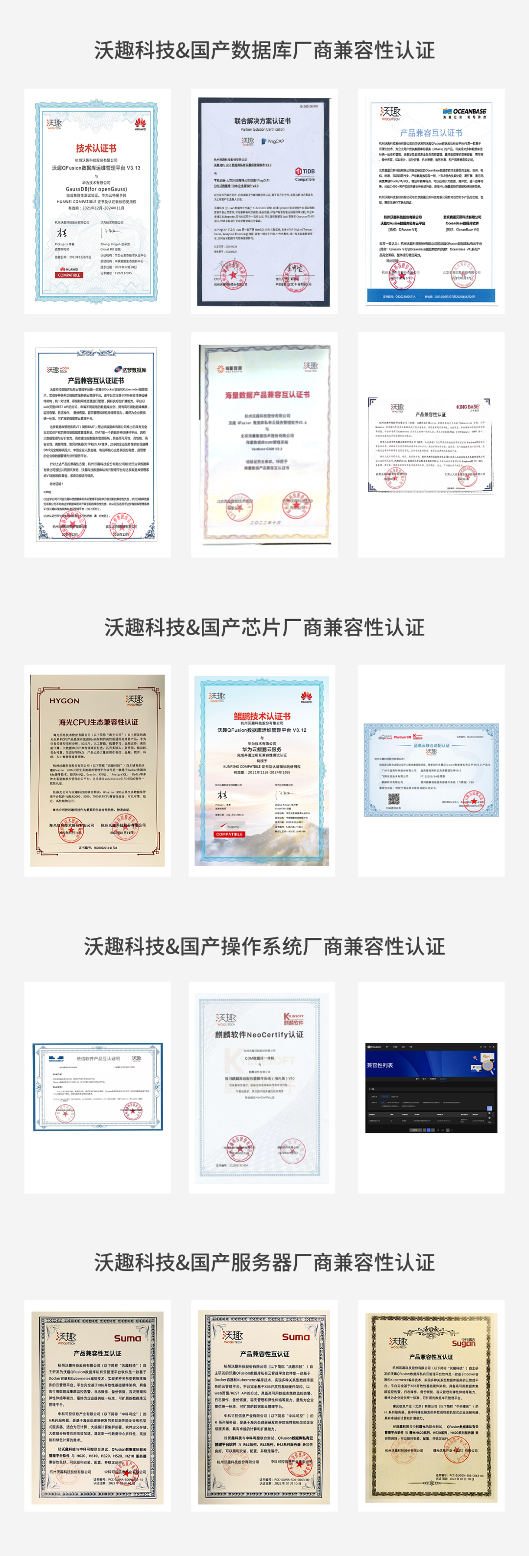 沃趣科技&国产软硬件厂商兼容性认证证书(部分展示)