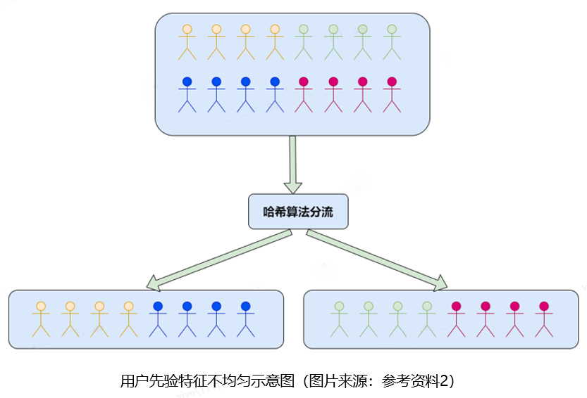 业务AB实验遇到的用户不均匀问题是指,用来评估业务效果的实验组、对照组两个人群集,由于人群划分方式(用户标识加密尾号分组等)、人群量级、或者观测指标本身特殊性等原因,导致两个人群集在核心效果评估指标的先验分布存在较大差异: