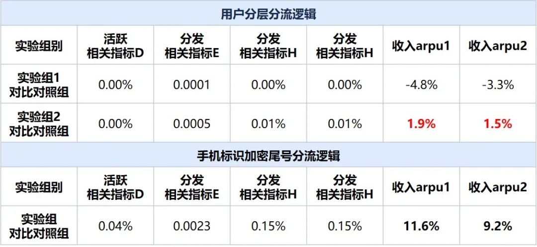 hash分组逻辑下,收入arpu1波动11.6%;但用户分层抽样逻辑下,两个实验组收入arpu1波动分别为4.8%和1.9%,收入arpu2波动分别为3.3%和1.5%,均匀性大幅提升。