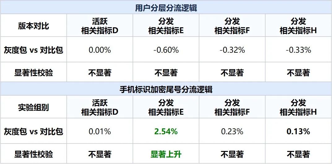 分发均匀性:用户分层逻辑下,各个分发指标均波动不显著;但手机标识加密尾号分流逻辑下,游戏分发相关指标E显著变化,即在该指标上存在用户不均匀。
