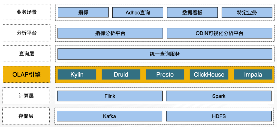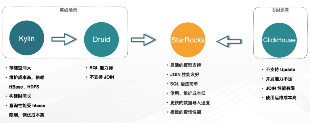 离线场景:最初使用 Kylin 进行指标分析,Kylin 是一种空间换时间的方案,并且依赖于 HDFS 和 HBase。此外,Kylin 在维度计算方面需要较长的构建时间,查询性能受到 HBase 的限制,调优成本较高。Druid 的引入虽然解决了以上问题,但 Druid 本身也存在一些局限性,比如 SQL 能力较弱,不支持 JOIN 操作。对于数据分析产品来说,如果只能使用宽表模型,那产品的灵活性就会受到一定的限制。