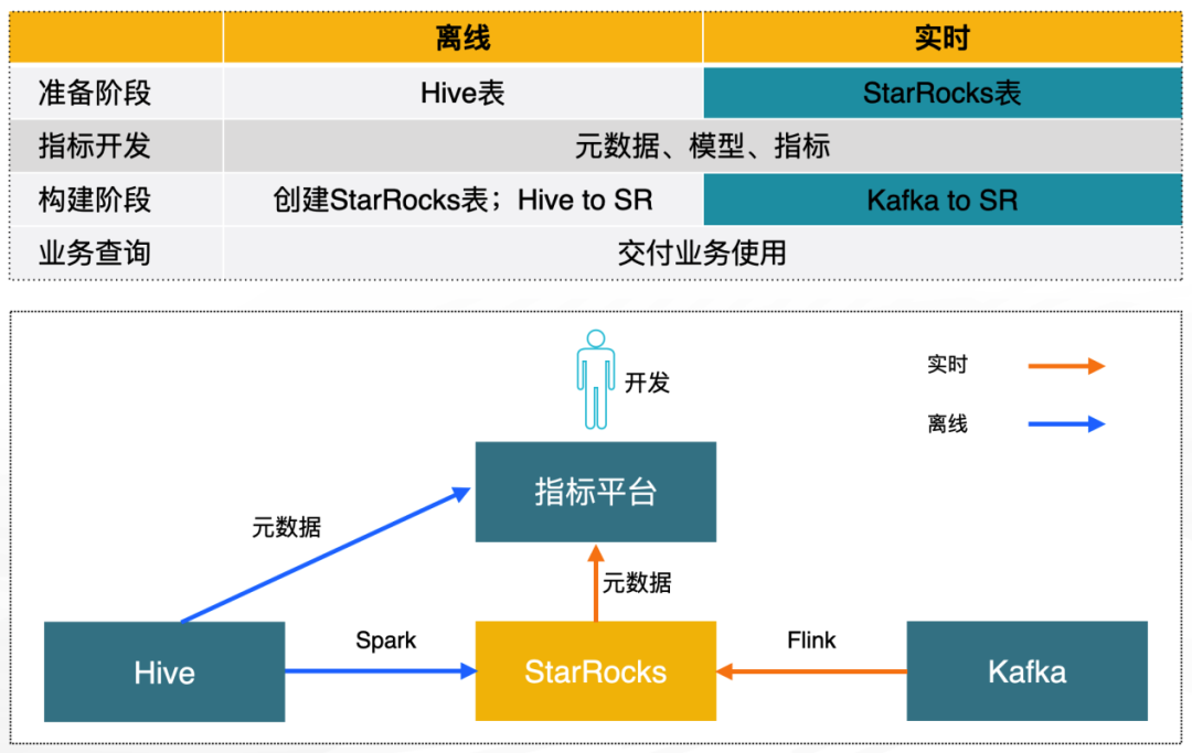 数据准备:数据开发人员准备 Hive 表和 StarRocks 表 指标开发:基于元数据进行模型和指标开发 模型构建:将模型转化到具体引擎的实现