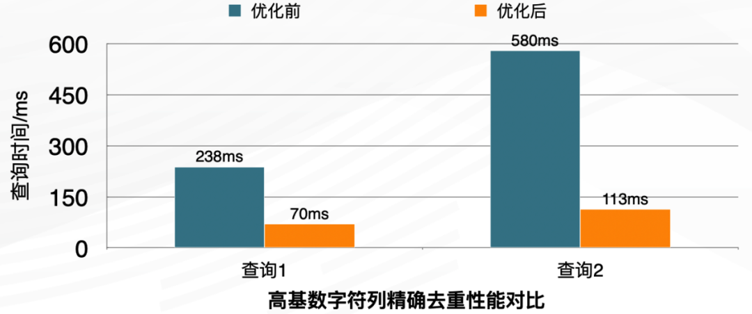高基数字符列精确去重:需要兼容之前的字符精确去重场景( Kylin、 Druid)使用 Hive 的全局字典来实现去重列编码。去重计数列使用 bitmap 类型,查询性能提高约 3~4 倍,在高 QPS 场景下,集群吞吐能力提升更加明显。