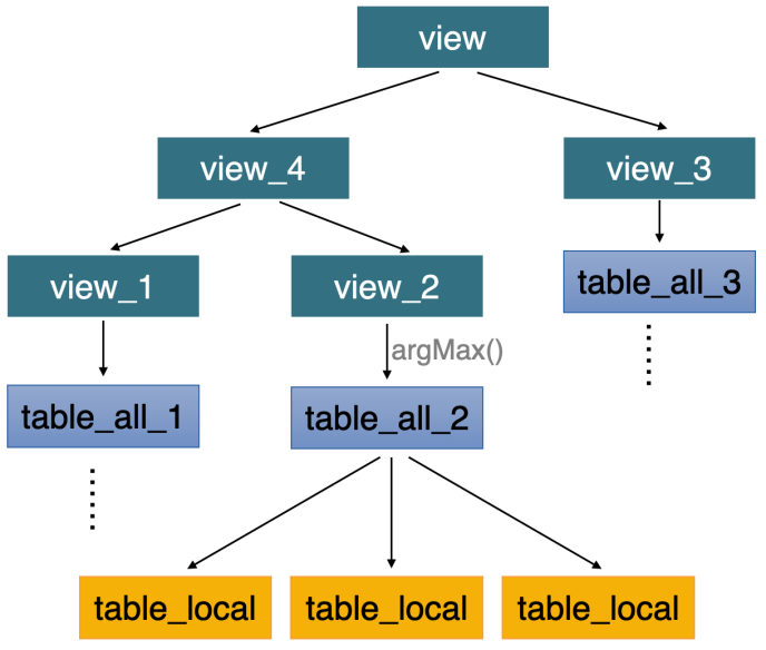ClickHouse 不支持直接的 update 操作,因此需要通过使用视图和 argMax() 函数计算最新数据以达到实时更新的目的。对一个复杂的模型而言,需要为每一张表都创建对应的视图,最终要多张表和视图才能实现,如图 7 所示: