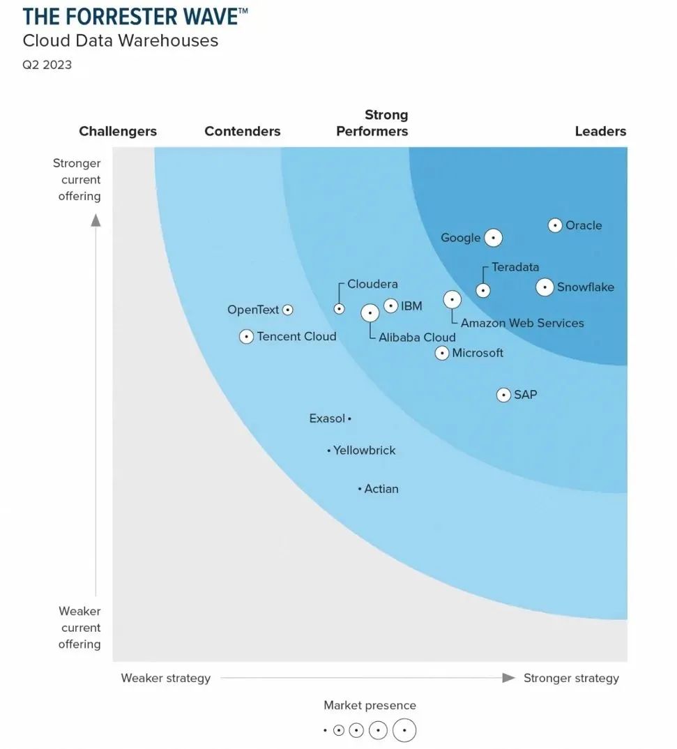 近日,国际权威咨询机构Forrester发布最新云数据仓库研究报告 《The Forrester Wave™: Cloud Data Warehouses, Q2 2023》,凭借产品性能和市场规模等方面的表现,阿里云连续第二次进入卓越表现者象限,是国内唯一挺进该象限的科技公司。