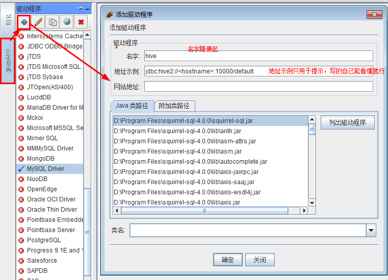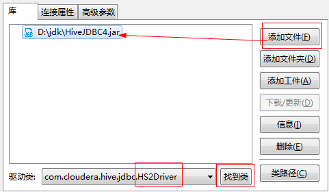 然后再添加我们前面下载的Cloudera提供的hive连接驱动: