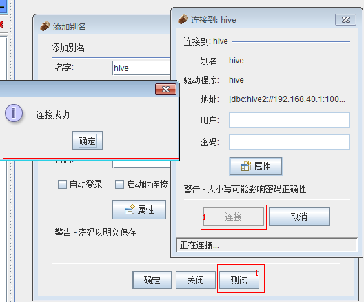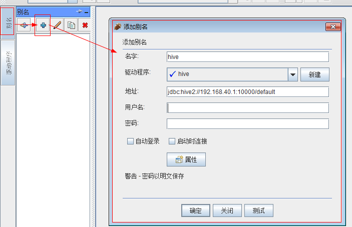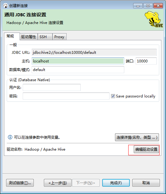注意:Cloudera提供的Hive JDBC驱动不需要考虑驱动包依赖的问题,默认的将Hive驱动所依赖的包都打包在里面。驱动类需要指定为