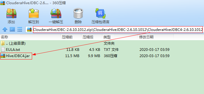 压缩包内的文件有点多,我选择只解压ClouderaHiveJDBC-2.6.10.1012.zip\ClouderaHiveJDBC-2.6.10.1012\ClouderaHiveJDBC4-2.6.10.1012下的HiveJDBC4.jar: