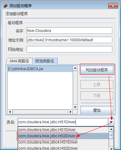 用Cloudera提供的驱动程序则只需要添加这一个驱动jar包即可,但类名记得修改为com.cloudera.hive.jdbc.HS2Driver
