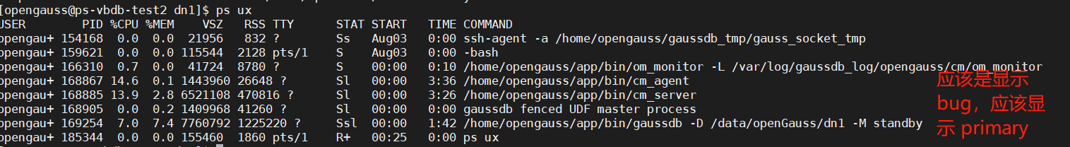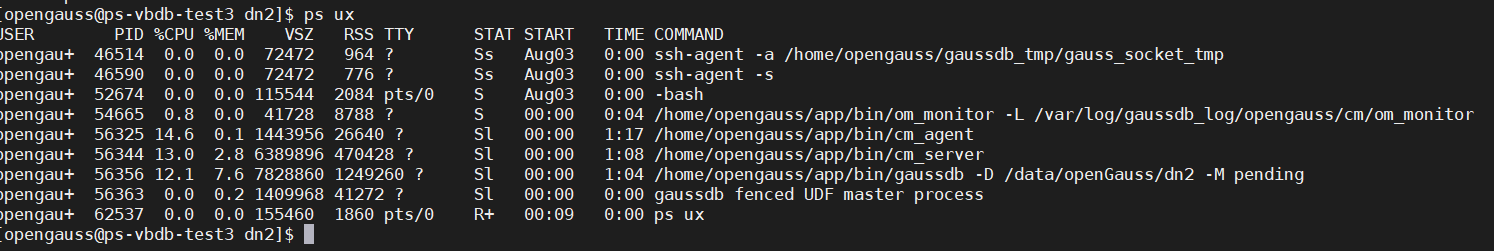 2 test2 xx.x.xx.xx 6002 /data/openGauss/dn2 S Primary Normal[opengauss@test1 ~]$ ps ux