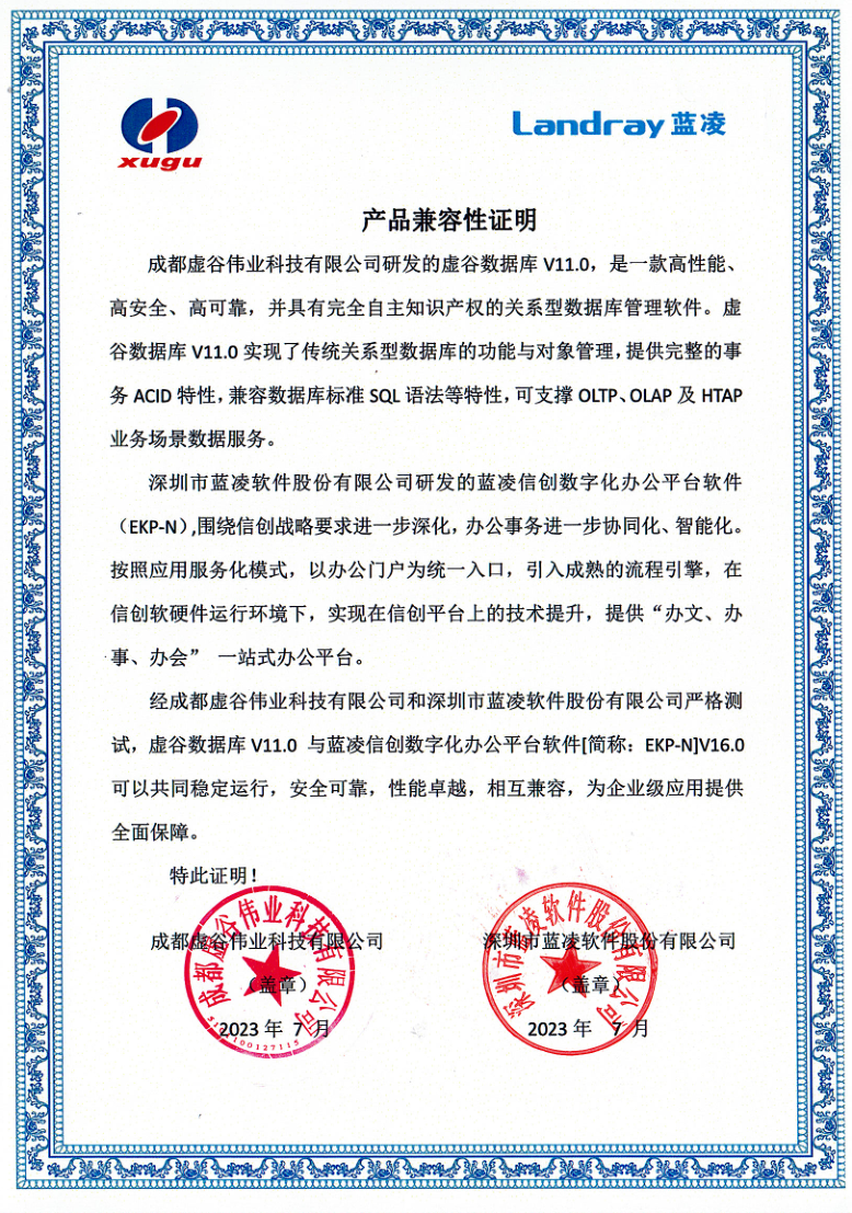 蓝凌信创数字化办公平台软件&虚谷数据库V11.0兼容证书