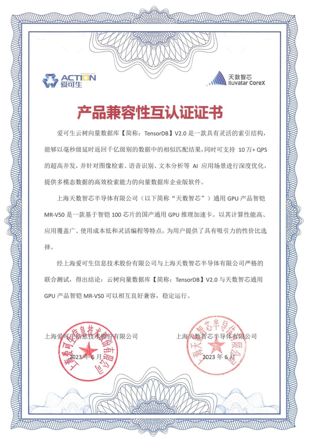 近日,上海爱可生信息技术股份有限公司(以下简称“爱可生”)向量数据库 TensorDB® 与上海天数智芯半导体有限公司(以下简称“天数智芯”)通用 GPU 产品智铠 MR-V50 完成产品兼容性测试,同时产品性能赶超主流推理产品。
