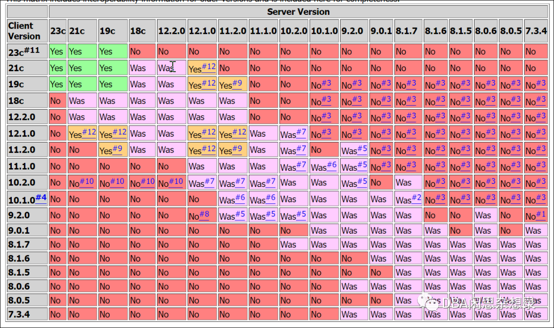 Oracle客户端与Oracle数据库之间是有兼容支持关系的,有些低版本的Oracle Client连接到高版本的数据库是不支持的,其实Oracle官方文档Client Server Interoperability Support Matrix for Different Oracle Versions (Doc ID 207303.1)[1]中有详细的介绍,如果你要升级数据库的话或遇到客户端与数据库兼容问题的话,建议仔细查看此文档。下面图片是文中的兼容矩阵关系图。