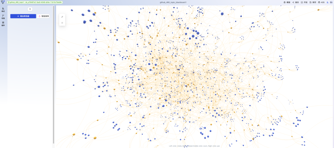 下图是GitHub中约500个开源项目仓库与话题组成的关系网络,密布的连线恐怕没有人能从中找到任何有用的信息。然而GitHub目前总共有3000000+的仓库!