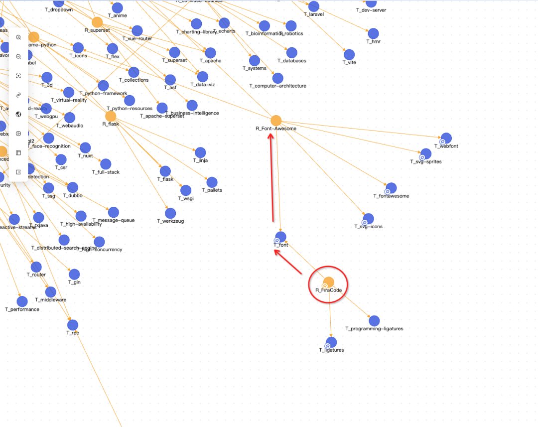 如图,在关系网络局部,从起点出发,通过箭头的个数可以标记话题/仓库到源点的距离。例如仓库FiraCode与仓库Font-Awesome的距离为2,通过2个箭头可到达,它们也是互相距离最近的关联仓库。