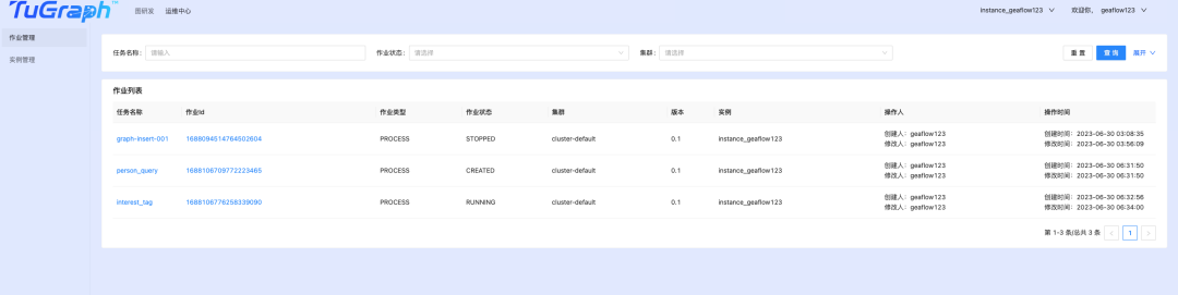 图查询以提交作业的形式完成,作业可以运行在本地或K8S集群中,TuGraph-Analytics提供控制台管理和回溯这些图研发作业。