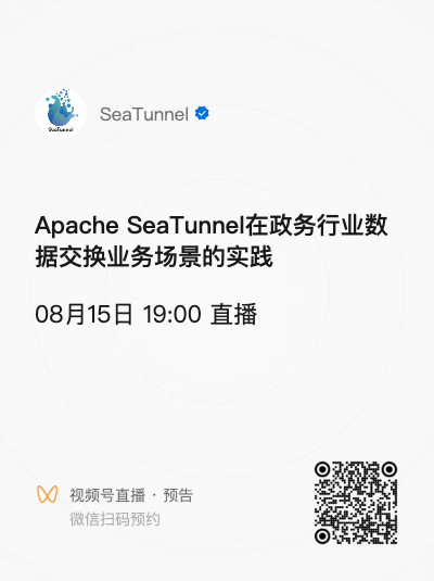 活动时间:2023 年 8 月 15 日 19:00 关注「SeaTunnel」视频号预约线上直播
